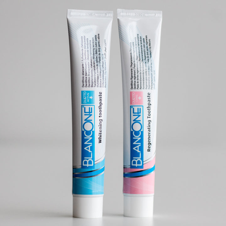 BlancOne® DUETTO is gebaseerd op de werking van twee tandpasta's met afwisselende enzymen en heeft een lage slijtvastheidsindex.