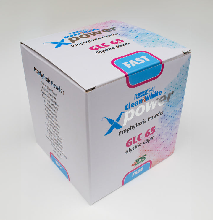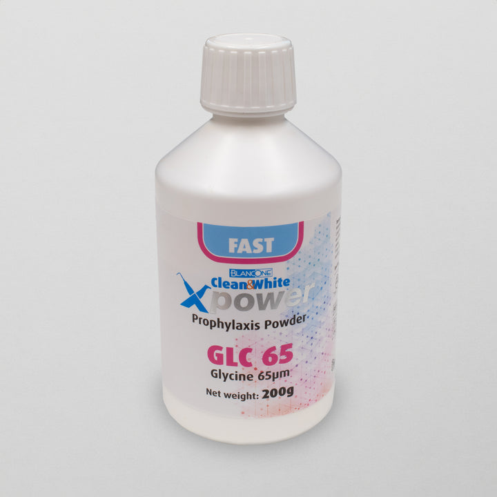 BlancOne GLC65 is een op glycine gebaseerd (aminozuur) reinigingspoeder dat speciaal is ontwikkeld voor de oppervlaktereiniging van tanden met poederreinigingsapparaten. De deeltjesgrootte (65 µm) en pH-waarde van 6 maken het een effectieve en veilige keuze voor het verwijderen van tandplak en vlekken uit glazuur. De precieze en zachte samenstelling vermindert het risico op beschadigingen, waardoor een effectieve maar veilige reiniging mogelijk is. Bovendien is het poeder geschikt voor gebruik bij witte glazuurlaesies en biedt het een uitstekende oplossing voor de zachte behandeling van het glazuur.